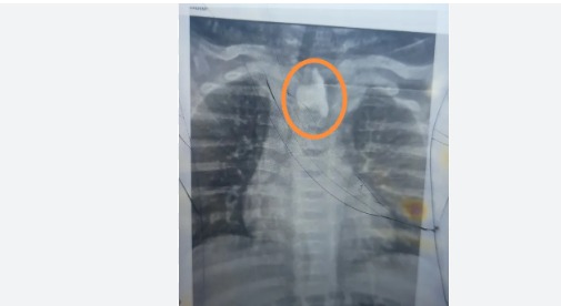 وكان الطفل دخل قسم الأطفال وهو يعاني من التهاب حاد بالشُعب الهوائية وصعوبة في التنفس، وبعد عدم استجابته للعلاج المنزلي، تم حجزه بالمستشفى وخلال الفحوصات، تم طلب أشعة عادية على الصدر، والتي كشفت عن وجود جسم غريب في الجزء العلوي من المريء، تسبب في انسداد مجرى الطعام.