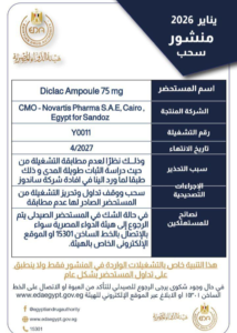 في أول منشور تحذيري للعام الجديد، أعلنت هيئة الدواء المصرية خلال يناير 2026 سحب ووقف تداول إحدى تشغيلات حقن Diclac Ampoule 75 mg، بعد ثبوت عدم مطابقتها لمواصفات الجودة المعتمدة، وذلك ضمن إجراءات الرقابة الدورية التي تهدف لحماية صحة المواطنين وضمان مأمونية الأدوية المتداولة في السوق المحلي.