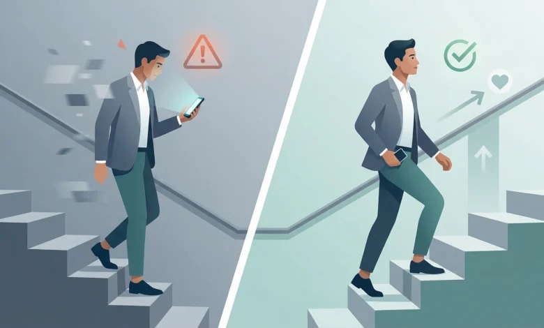 الاعتياد على استخدام الهاتف أثناء الحركة لا يغير من قدرات الدماغ ولا يوسع حدوده. فحتى نظرة سريعة إلى الشاشة قد تكون كافية لتأخير رد الفعل في لحظة حرجة، خصوصًا على الدرج حيث لا مجال للخطأ.